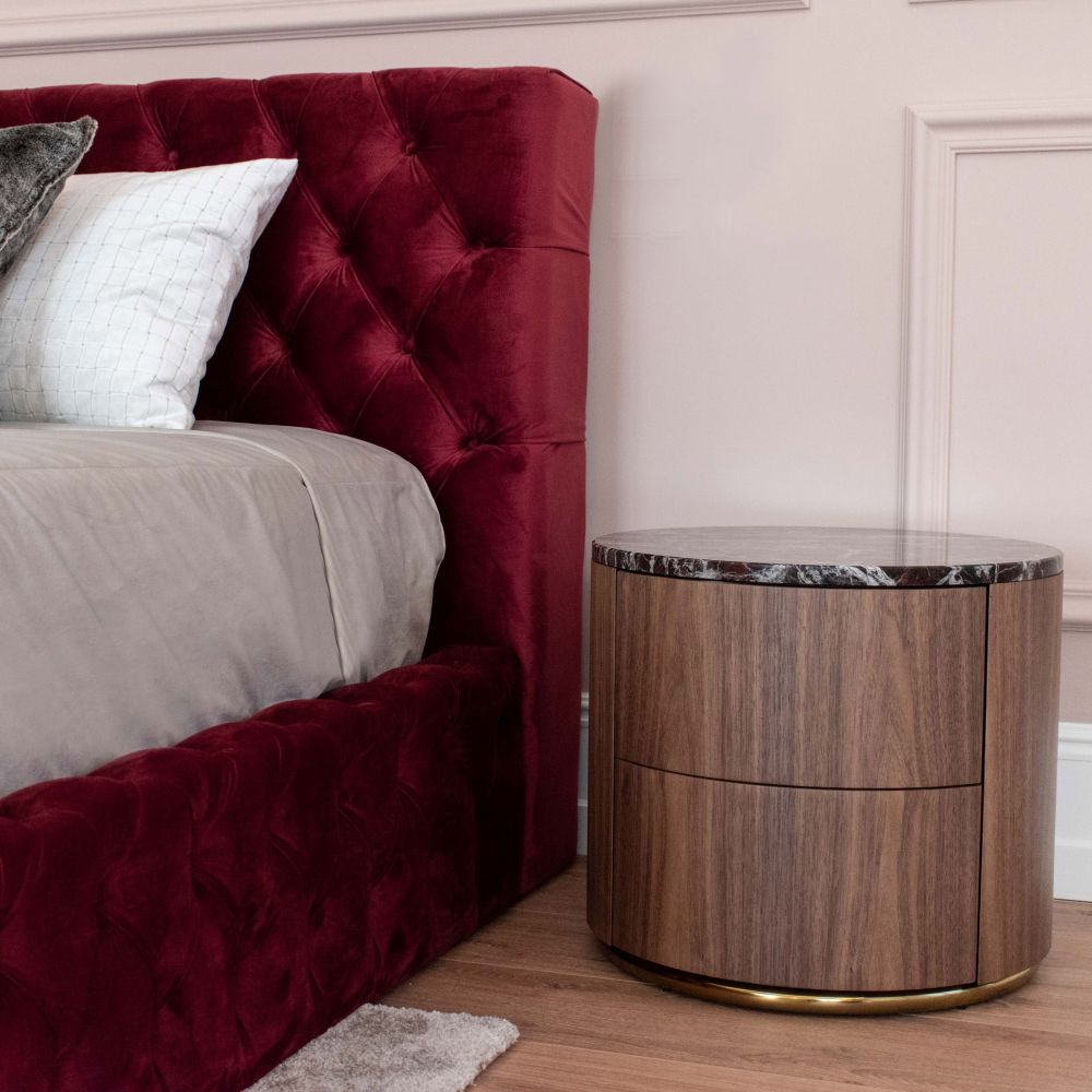 Mesita de noche con doble cajón, cuerpo en madera, zócalo de latón y sobre en mármol negro. Un diseño lujoso para la decoración de tu dormitorio.