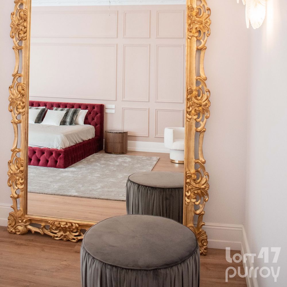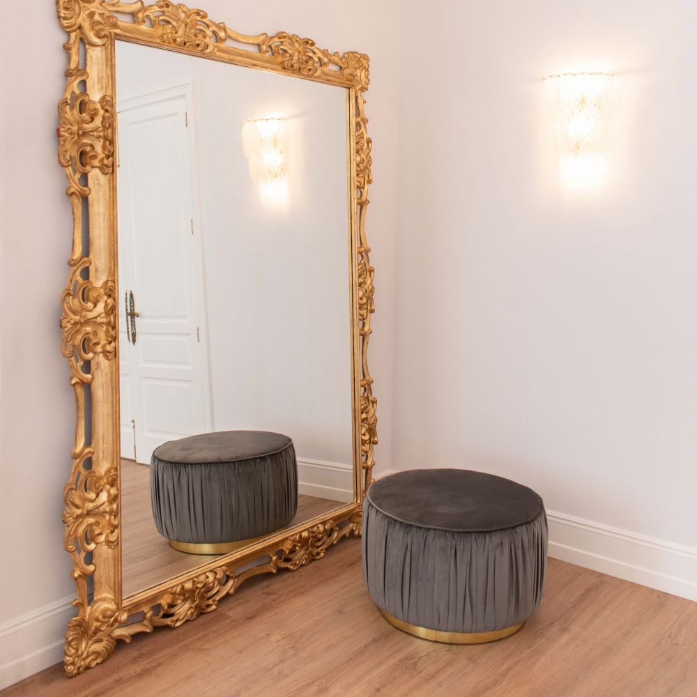 Pouff redondo, tapizado plisado en terciopelo color gris antracita con zócalo de madera o de latón.