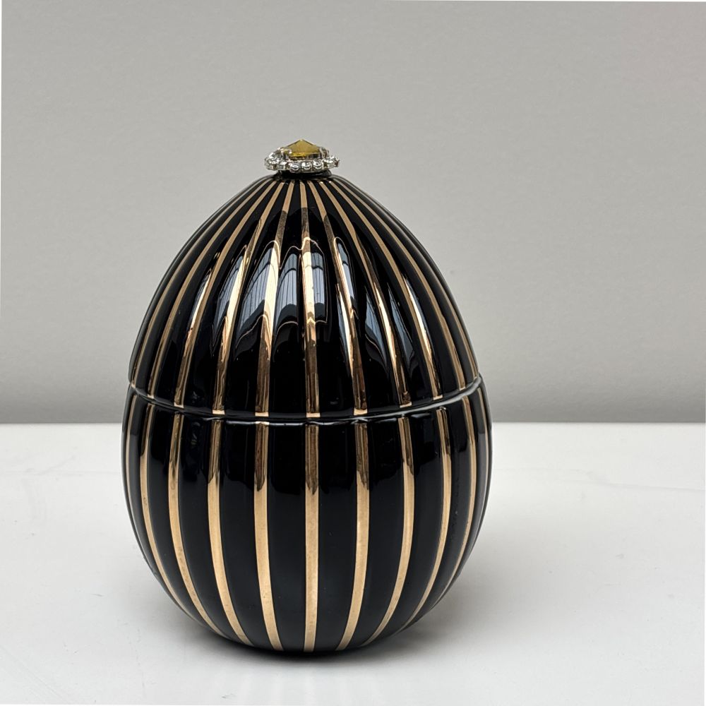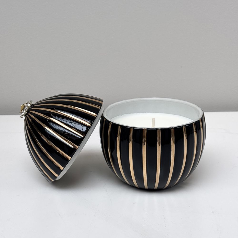Vela aromática con diseño en huevo negro con rayas doradas. Fabricado en cerámica y pintado a mano con oro de 18k y pedrería. Esta vela con diseño de huevo negro con rayas de oro te seducirá por su aroma elegante con notas ahumadas.