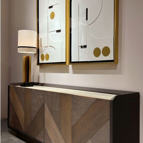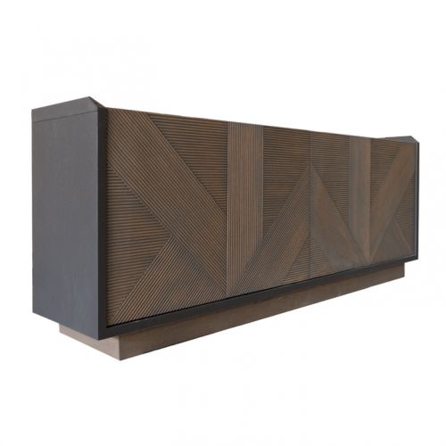 Aparador Vértice de 4 puertas y 2 cajones interiores. Fabricado en madera de roble con el sobre en porcelánico.