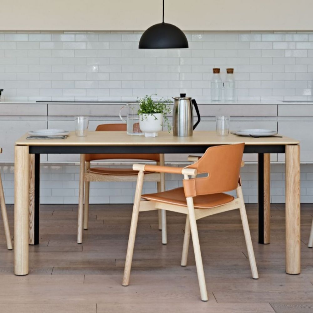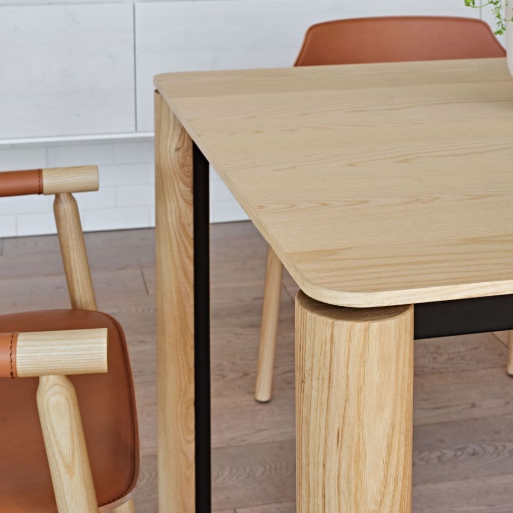 Mesa fija con base de cuatro patas en madera de fresno teñida con núcleo de metal lacado. Estructura metálica.