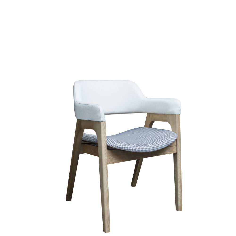 Butaca de comedor con estructura de madera en fresno y asiento/respaldo tapizado.
