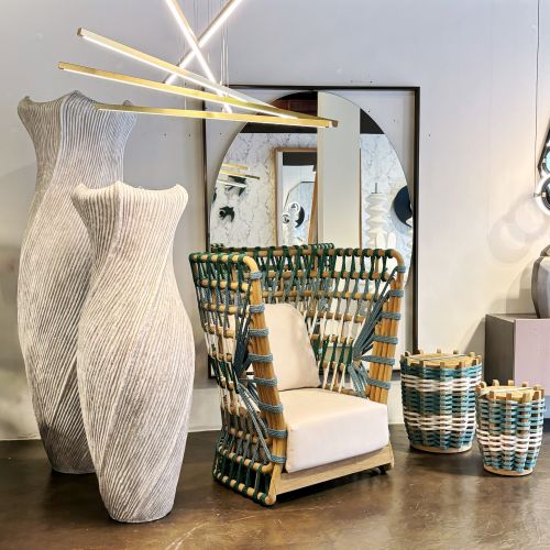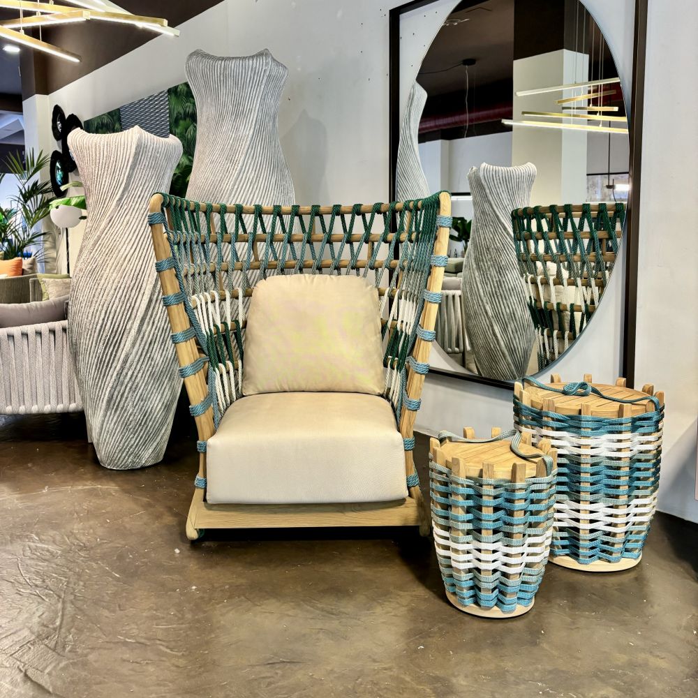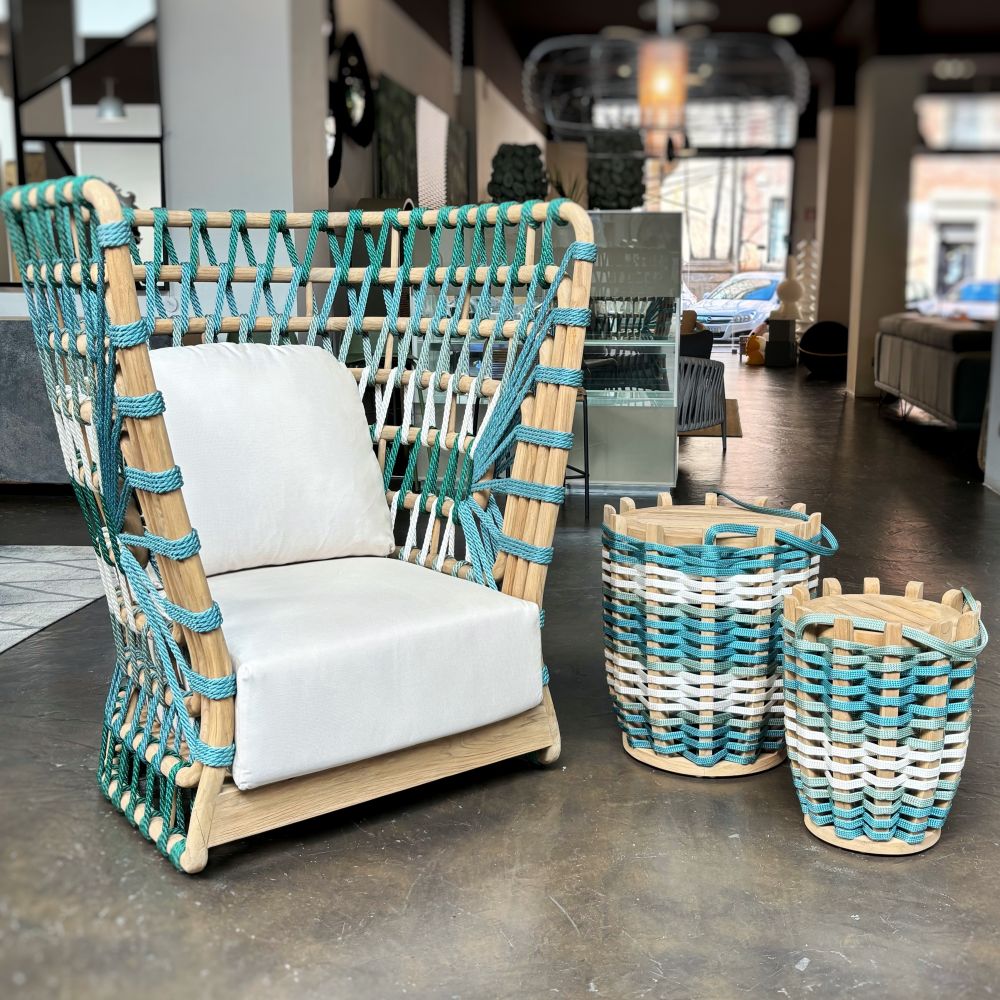 La Butaca Capri será la protagonista de cualquier estacio outdoor gracias a su elegante diseño y sus dimensiones. Con asiento extraible, esta pieza se ha diseñado con una estructura de madera natural combinada con un trenzado de cuerda en tonos azulados.
