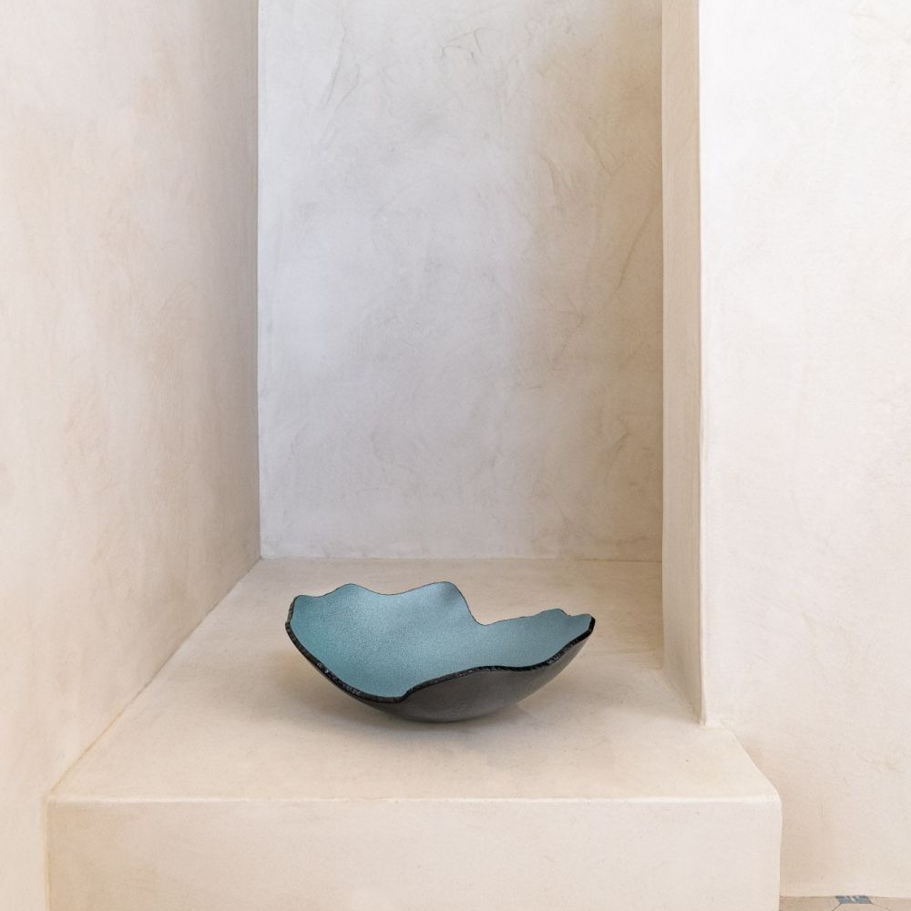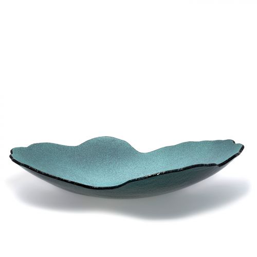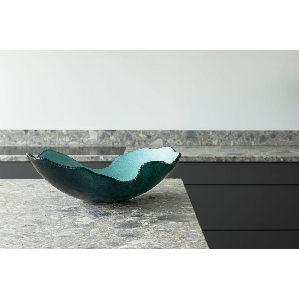 Estas piezas únicas han sido hechas a mano por la artista brasileña Regina Medeiros. A lo largo de los años, ha dominado las técnicas de fundición y pintura en vidrio y ha introducido el uso de óxidos locales y componentes de oro para crear efectos únicos. Este centro de mesa en color azul, tiene un diámetro de 40cm.