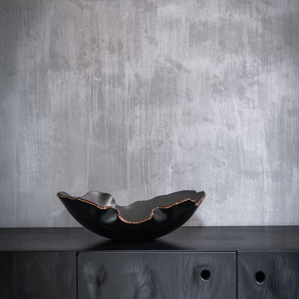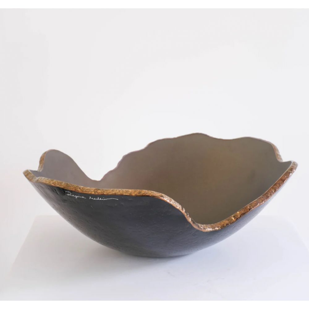 Estas piezas únicas han sido hechas a mano por la artista brasileña Regina Medeiros. A lo largo de los años, ha dominado las técnicas de fundición y pintura en vidrio y ha introducido el uso de óxidos locales y componentes de oro para crear efectos únicos. Este centro de mesa en color negro mate, tiene un diámetro de 50cm.