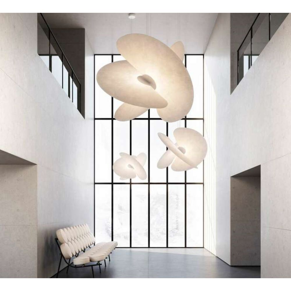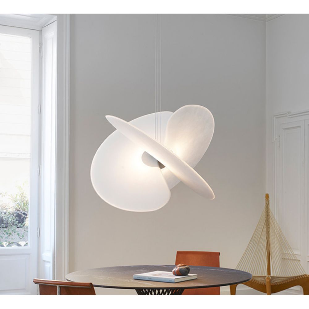 Esta lámpara nace de la intersección de tres grandes abanicos, fabricados con un material nuevo en el sector del diseño y tomado prestado del mundo de la alimentación, con un aspecto similar al papel de arroz, para difundir la luz de forma uniforme.
