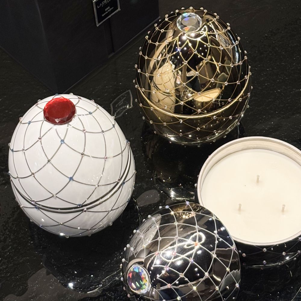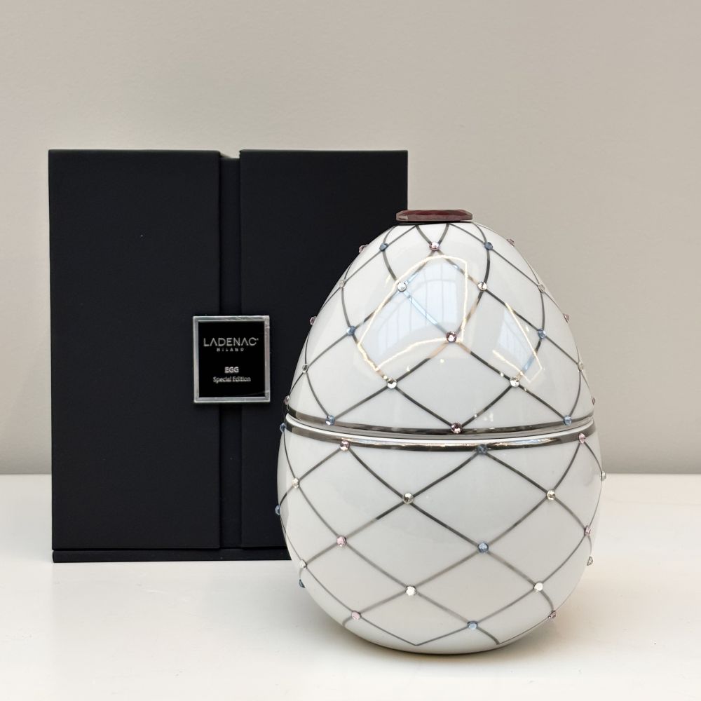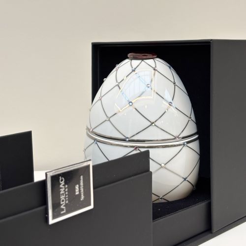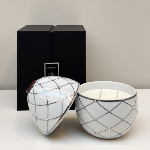 Vela en contendor de cerámica en forma de huevo, pintado a mano en color blanco y plata y decorado con pedrería.