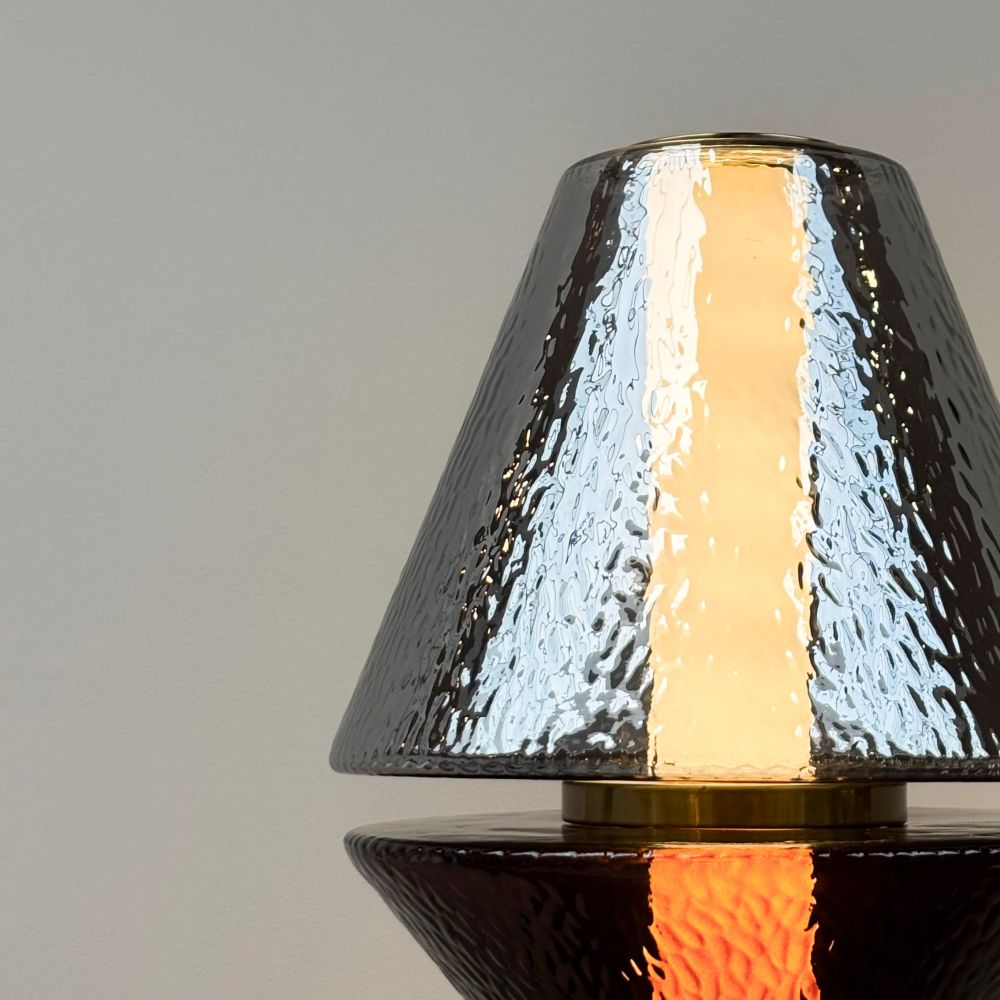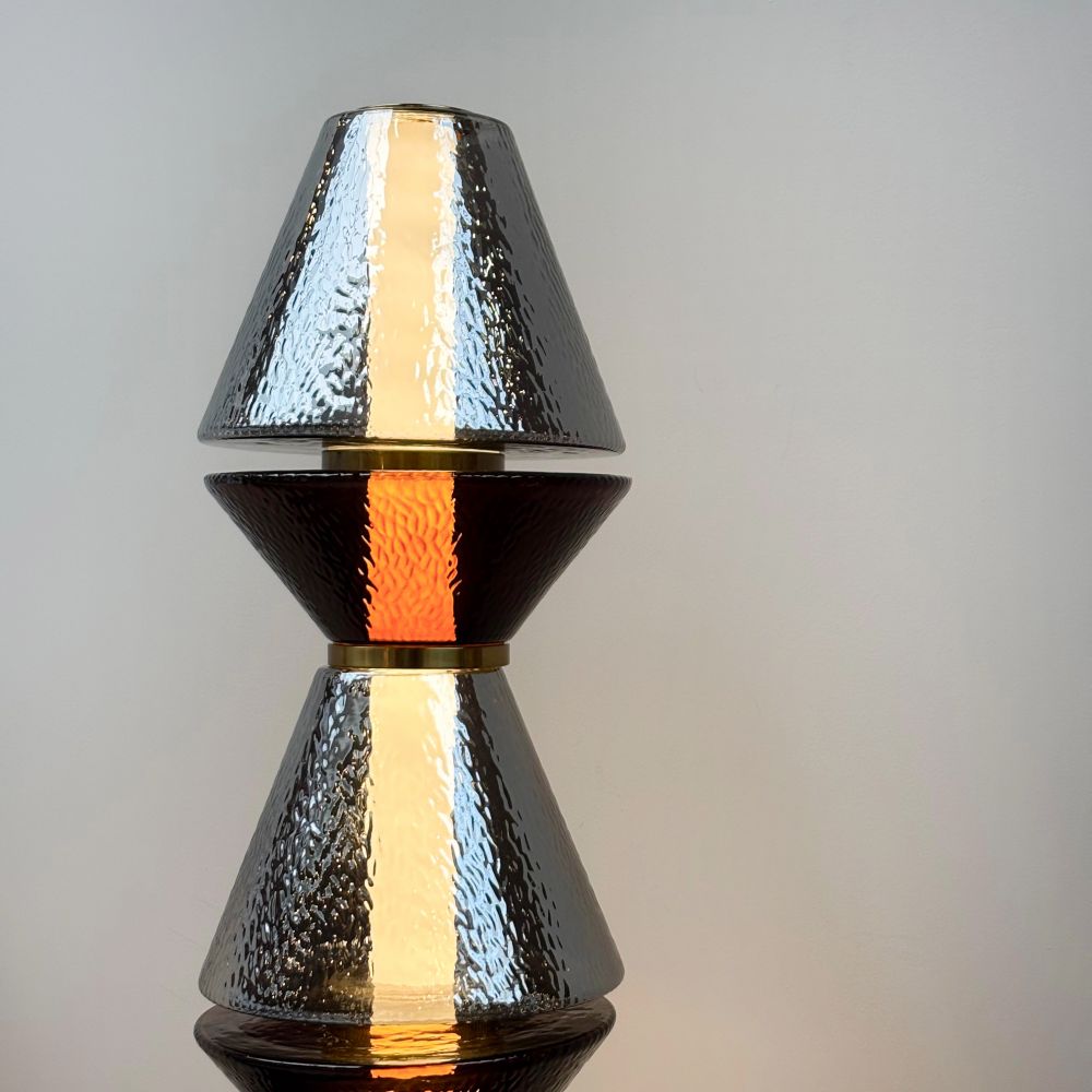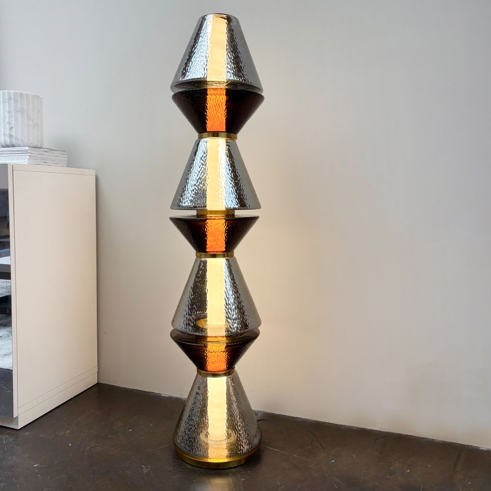 La lámpara de pie con diseño escultórico en cristal gris y hierro dorado.
